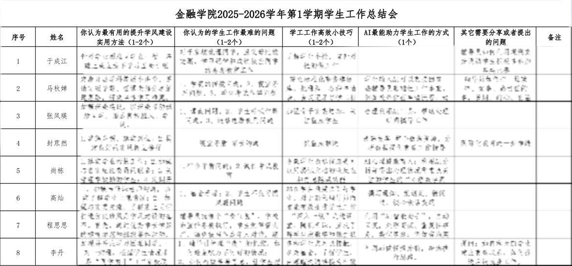 为确保会议研讨的深度与实效,全体辅导员在会前即启动系统性复盘工作。大家结合自身岗位实践,围绕学风建设、学生管理、事务办理等核心模块,梳理出最具实操性的工作方法、最具代表性的难点问题、最能提效的工作技巧,以及AI 赋能学生工作的创新路径,并以结构化表格形式完成汇总。这一前置性工作,不仅让每位参会者带着思考、带着方案参会,更推动会议从 “泛泛交流” 转向 “精准破题”,为后续高效研讨奠定了扎实基础。
