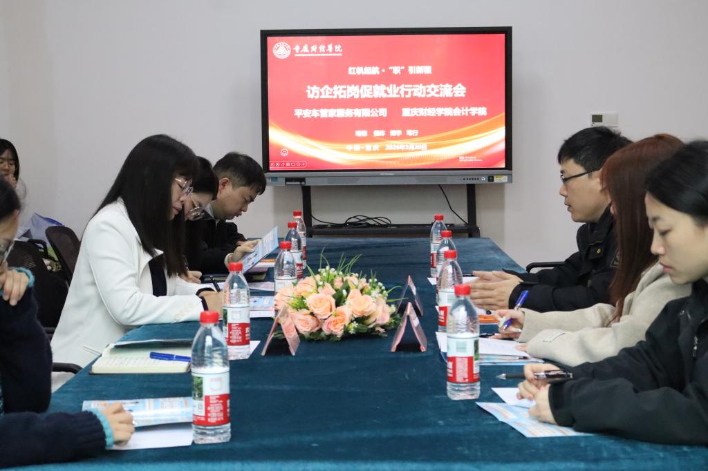 为深入贯彻就业优先战略,拓宽毕业生高质量就业渠道,深化校企协同育人机制,3月20日,会计学院与平安车管家服务有限公司在图书馆大研讨室举行“红帆起航·‘职’引新程”访企拓岗专项行动交流会。平安车管家全国人力总监张帅及企业招聘团队代表,会计学院党总支书记宋钰静、副书记冉光波,学团办主任谭白冰、副主任陈晨,大四辅导员代表徐铭醴参加会议。双方围绕人才培养模式创新、校园招聘效能提升及未来合作方向展开深入务实的交流。